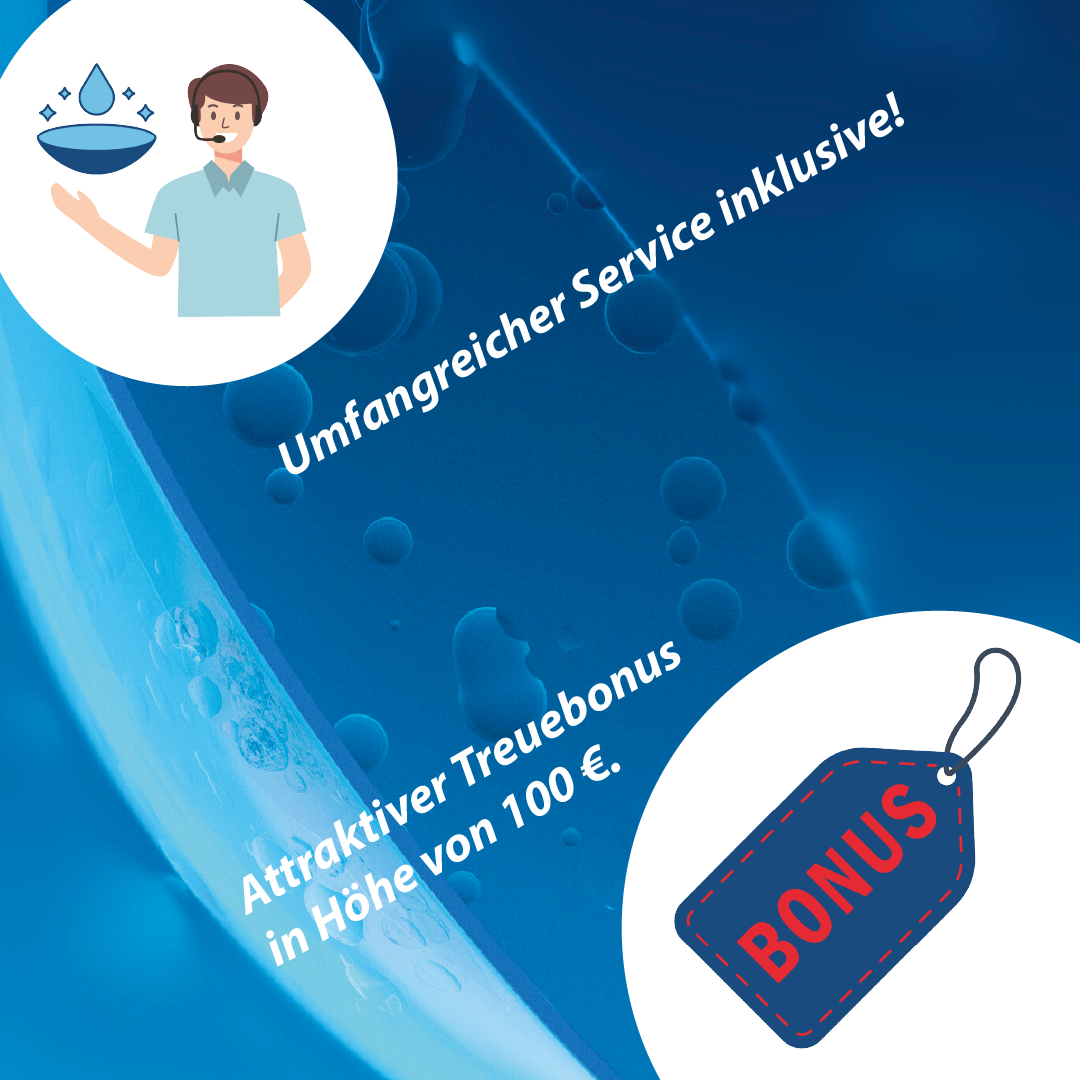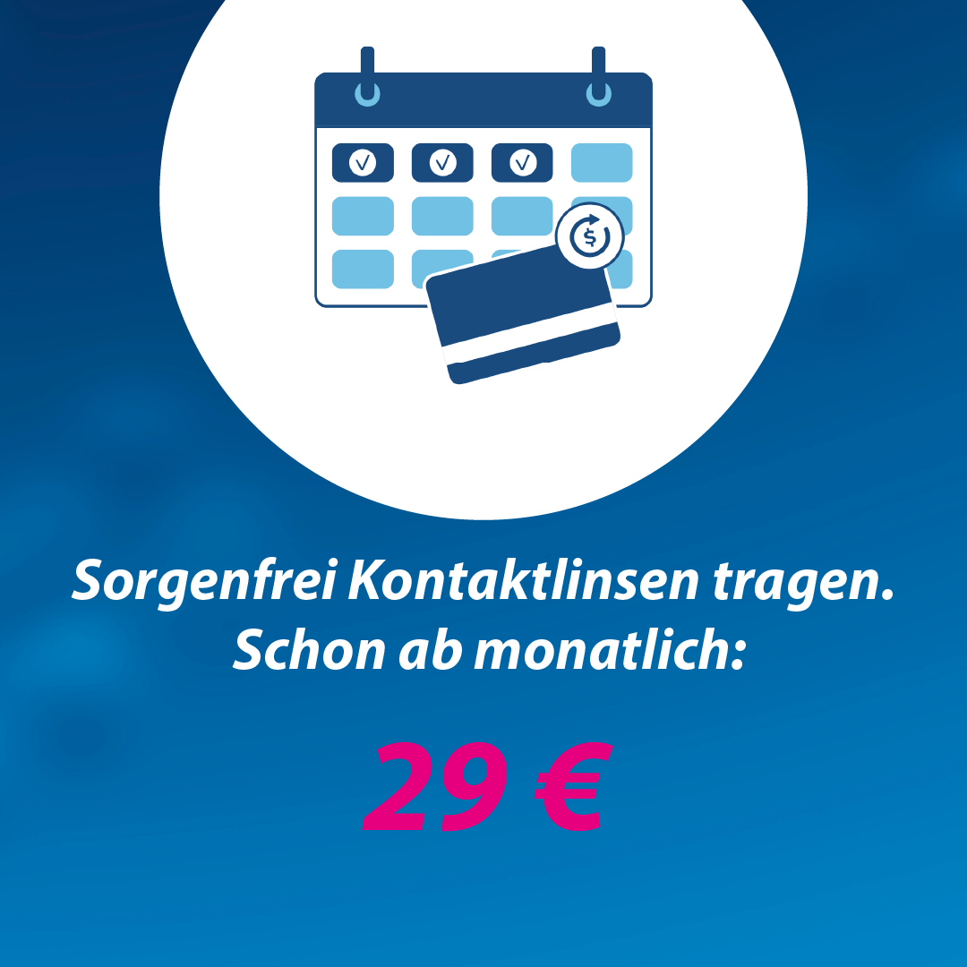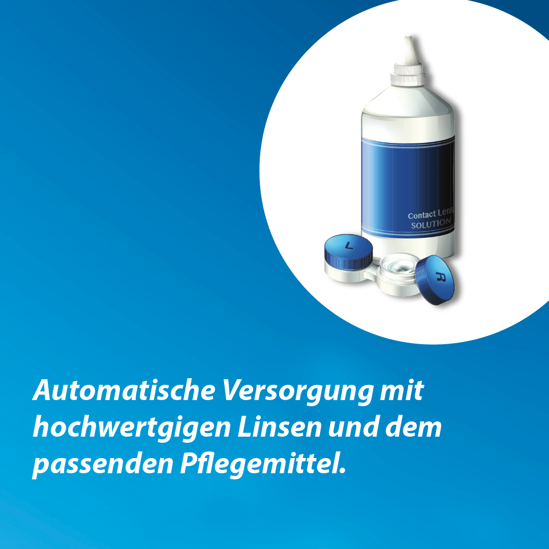 Für einen monatlichen Betrag ab 29.-€ erhältst du voll automatisch in regelmäßigen Abständen deine individuell angepassten Kontaktlinsen mit dem darauf abgestimmten premium Pflegemittel.